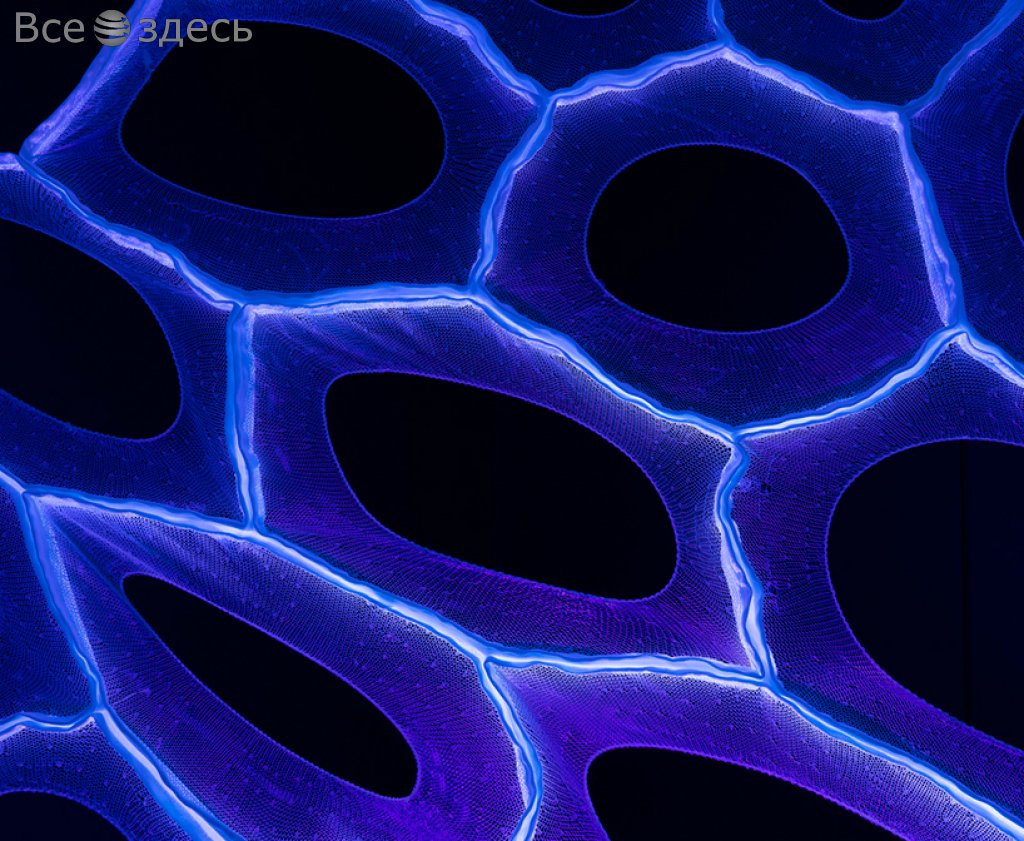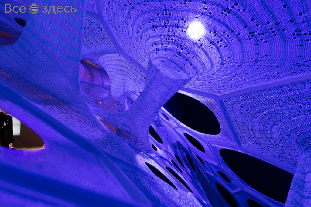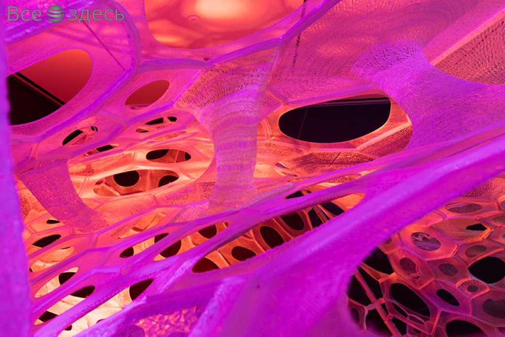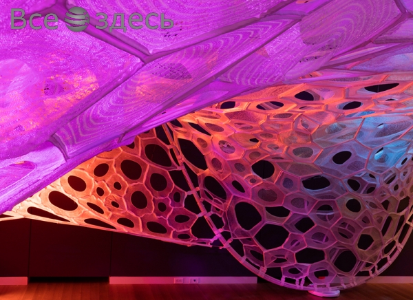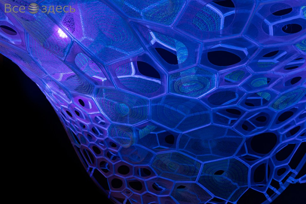 Дженни Сабин, известная дизайнер из Америки, представила потрясающий павильон, который создан из интересного вязанного материала, светящегося в темноте. Все части данного павильона сделаны на суперновом 3D-принтере. Они соединяются между собой, кроме того, установлены на большой алюминиевый каркас. Все это меняет цвет и оттенки. В результате получилась необычная конструкция, которая на форме своей больше напоминает определенного вида корабль из Космоса. Инсталляция собирает сотни зрителей, которым интересно рассматривать ее загогулины и многочисленные святящиеся повороты.