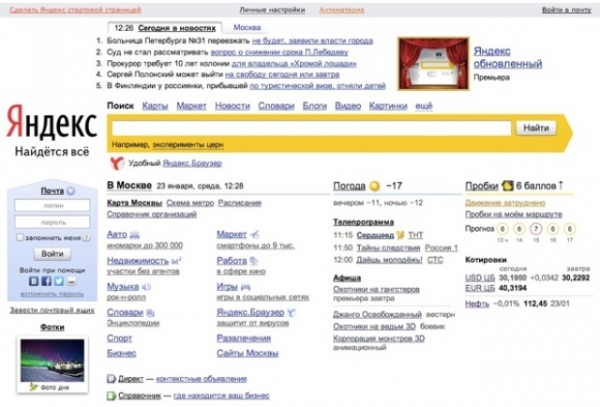 Сместилось меню входа в «Яндекс.Почту». Он теперь находится в правом верхнем углу страницы, уступая место логотипу сайта. А вот под ссылкой, которая ведет на «Яндекс. Карты», теперь появились пиктограммы категорий заведений. Там одним кликом можно найти списки кинотеатров, схему метро, а также аптеки и развлекательные заведения.