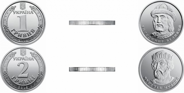 В информации говорится, что уже очень скоро в обороте появятся сребристые и небольшие монеты номиналом в 1 и 2 гривны. Украинцам не следует опасаться, что новые деньги сделают их кошельки не подъемными. Монеты будут очень легкими. Что немаловажно – легко узнаваемыми, как по их цвету, так и по размеру. Спутать их с другими монетами при расчетах будет очень сложно. На реверсе 1 гривны изображен князь Владимир Великий, на реверсе 2-гривниевой – князь Ярослав Мудрый. Аверс обеих монет ничем не отличается от обратных сторон всех остальных монет, уже имеющихся в обороте страны. Это малый Государственный Герб Украины, название страны, номинал - в обрамлении орнамента времен Древней Руси. Сообщается, что действующие в настоящее время бумажные деньги достоинством в 1 и 2 гривны по-прежнему будут действительны при любых расчетах – до самой последней купюры. В информации НБУ говорится, что их просто прекратят печатать и возвращать в оборот.