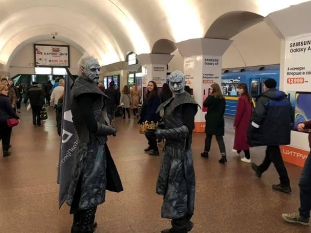 Согласно обнародованным сведениям, инцидент произошел на днях на станции Киевского метро «Майдан Незалежности». Там пассажирами были замечены люди в гриме белых ходоков из сериала «Игра престолов». Персонажи популярно во всем мире фэнтези предлагали прохожим сфотографировать и попробовать себя в роле короля Семи Королевств, примерив его венец.