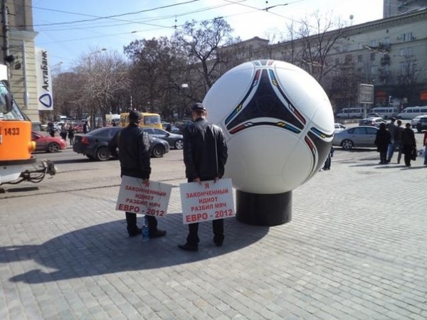 Оказалось, что так их «наказали» владельцы одного из торговых центров Днепропетровска. На днях в ТЦ «Passage» установили скульптуру – огромный мяч с символикой «Евро-2012». Не постоял он и пару дней, как у местных хулиганов «зачесалось» его разбить. Поздно ночью, выпив для храбрости, они хотели «поиграть» мячом в футбол, но не сопоставили свои силы и материал, из которого он сделан. В результате, мяч треснул.