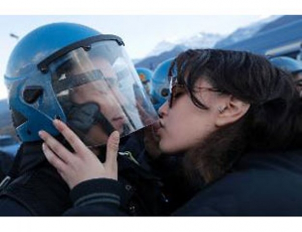 Отметим, что речь идет о том, что недавно произошла акция манифестантов, которые протестовали против стоящейся линии для скоростных поездов из Турина в Лион. Они объединились в движение под названием NO TAV, случилось противостояние между активистами и полицейскими. Одна из участниц акции решила поцеловать прямо в каску Сальваторе Пиччионе, 25-летнего полицейского, который стоял в оцеплении.