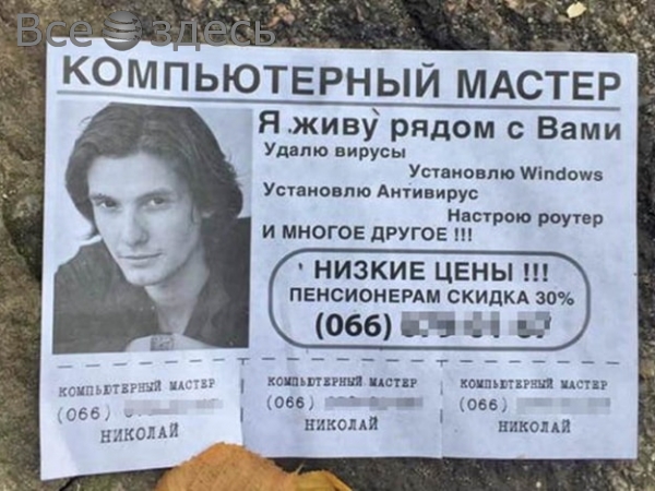 Как правило, такие объявления начинаются со слов «Компьютерный мастер. Живу рядом». Также указывается, что пенсионерам полагается скидка, а вызов на дом бесплатный. При этом на самой листовке размещена фотография якобы того самого мастера, однако при детальном рассмотрении можно понять, что снимок взят из интернета и зачастую на фотографии изображен голливудский актер. Однако миловидное лицо «программиста» вызывает доверие у пенсионеров, на которых и рассчитаны эти объявления.