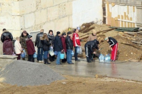 С 25 числа более 63 тысяч евпаторийцев живут практически без воды. На магистральном водогоне Чеботарск-Евпатория коммунальщики работают без перерывов круглые сутки. До вчерашнего дня в некоторых районах города вода в кранах была, но только определенное время утром и вечером. С сегодняшнего дня не будет и этого ограниченного водоснабжения. По Евпатории воду развозят пятьдесят цистерн, а жители выстраиваются в длинные очереди, чтобы набрать ведра и пластиковые емкости. Детские садики и школы уже переведены на сухой паек.
