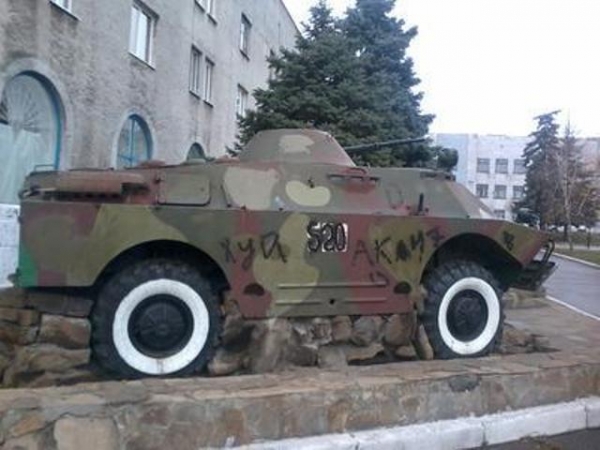 Бронированный кузов, установленный на БРДМ-2, защищал наших воинов от пуль различного стрелкового оружия, а также от осколков мин. Но против обычных трусливых гопников, вооружённых банальным баллончиком с краской, броня оказалась бессильной. Вандалы «украсили» бок машины привычным «заборным» словом из трех букв. Затем-то навели поярче бортовой номер машины боевой пехоты «520», а затем, что вовсе непонятно, приписали рядом «АК-47». Совсем непонятно, причём тут автомат модели Калашникова. Но вряд ли целесообразно искать какую-то логику в действиях тех, кто способен на столь бессмысленно-циничный поступок.