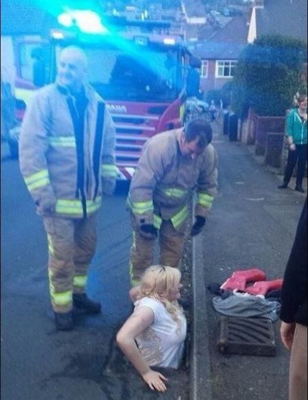 Очевидцы, естественно, делали фото спасения. На них видно, что двое пожарных, взяли застрявшую беднягу под руки, и потащили из люка. Это получилось у них довольно быстро и без осложнений.
