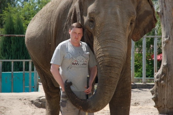 Известно, что Олег Грищенко слонами занимается уже давно. Он бывал на Шри-Ланке, изучая опыт местных слоноводов. Он по праву считается одним из самых лучших специалистов в восточной части Европы. В зоопарке Олег работает с 1993 года, а первое «общение» со слоном у него было еще в студенчестве.