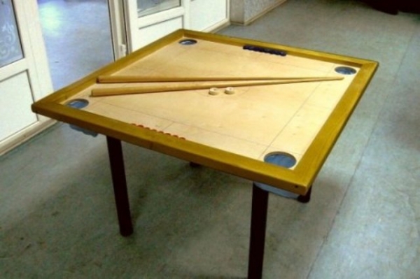 Участники презентации узнали, что игровой стол выполнен в форме квадрата. Его размер - метр на метр. Площадь разделена на четыре зоны. В них располагаются фишки двух цветов, предназначенные каждому из участников. По углам стола расположены лузы. Задача, которая стоит перед игроком – забить с помощью кия или битка свои фишки в любую из луз. Ударять по фишкам можно по очереди. А побеждает тот, кому первому удается загнать все свои фишки в лузы.