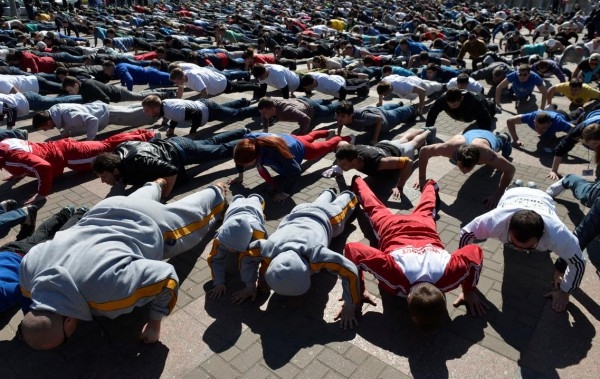 В Киеве отличилась молодежь. Собираться она начала с раннего утра, место встречи – парк «Победа». Желающих отжиматься было настолько много, что только регистрироваться пришлсь около часа.